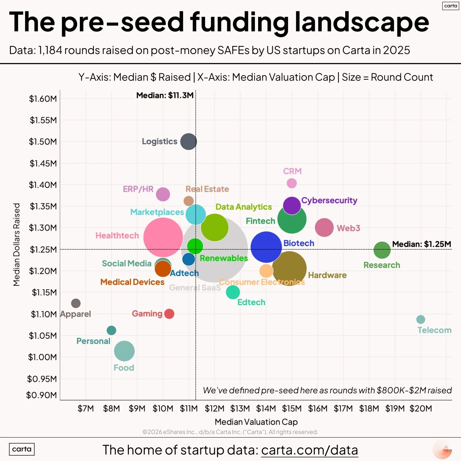 • Geography influences things. There are strong concentrations of pre-seed angels and funds in the core venture markets like SF, which means more rounds there, which means those rounds affect the national medians. Raising in Charlotte? Probably expect a little less.