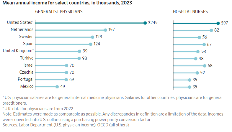 American doctors and nurses generally make more than their counterparts in other countries, another factor that can drive up the cost of care.